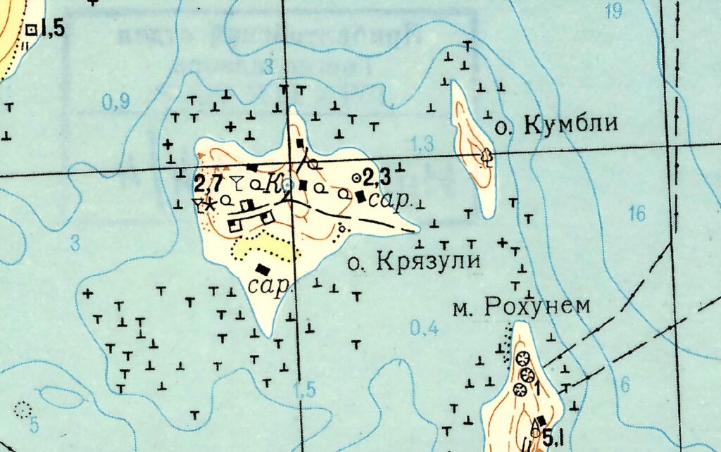 Kräsuli 1961. aasta NSVL topokaardil. Saarel on näha kolme talupidamist ning saare läänekaldal asuvaid liitsihi meremärke. Kaart: maa- ja ruumiamet