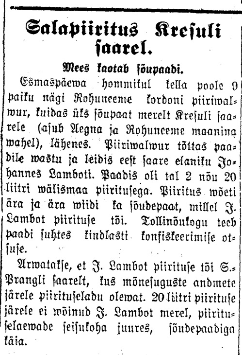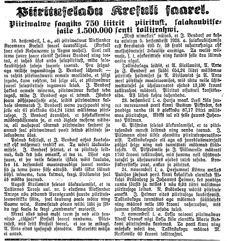 Nii võis ajalehest lugeda, et detsembris 1929 leidis piirivalvur Jalmar Bendorfi vana purjepaadi alt 67 plekknõud 654 liitri piiritusega. J. Bendorf püüdis piirivalvurit kavaldada, väites, et tahab salapiiritust üles anda, kuid soovis tegelikult jälgi segada. Kohalikud hakkasid Bendorfi kutsuma „Kresuli kuningaks“. Ka Johannes Lamboti maal avastati korduvalt piiritusenõusid. Vedajad olid aga leidlikud ja kui millegagi vahele jäädi, siis peideti teinekord paremini. Näiteks leiti 1930. aastal J. Lamboti maalt sambla seest isegi piiritusega täidetud klaasist võrgupoi. 1931. a tabati J. Lambot paadiga Prangli saarelt 20 liitrit salapiiritust üle toomas. 1933. a tabati Lembit Bendorf Tallinna sadamas salapiiritusega. 1934 püüdsid Isak ja Lembit Bendorf 10-liitrise nõu piirivalvuri eest merre uputa. Bendorfi perekond tegeles salapiirituse ja salakauba veoga läbi kahe põlvkonna kuni 1930-ndate lõpuni.