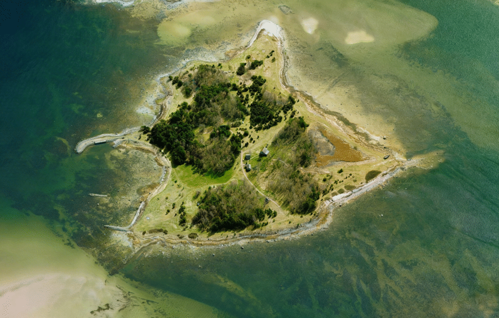 Vaade Kräsuli saarele läänest. Allservas on näha uppunud pargast, ülalservas liivalaide, mis madala mereveetasemega esile kerkivad. Maa- ja ruumiameti kalde-nurgafoto, 2024 mai.